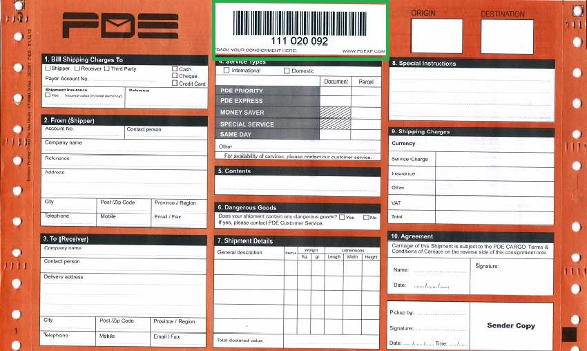 PDE on-line Track & Trace service is recommended as a prompt way to check the last status of your shipments and the results provide you with detailed progress along with accurate time and place of your shipments at all times. You can track your shipments using the Order Number which have been emailed to you or your Consignment Number which is mentioned at the top of your PDE Bill as shown below.